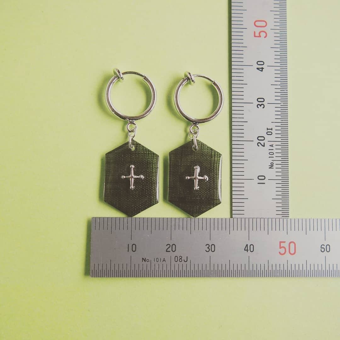 十字架じゃないよ☆結城紬のイヤリング(カーキグリーンC / 亀甲絣図案)