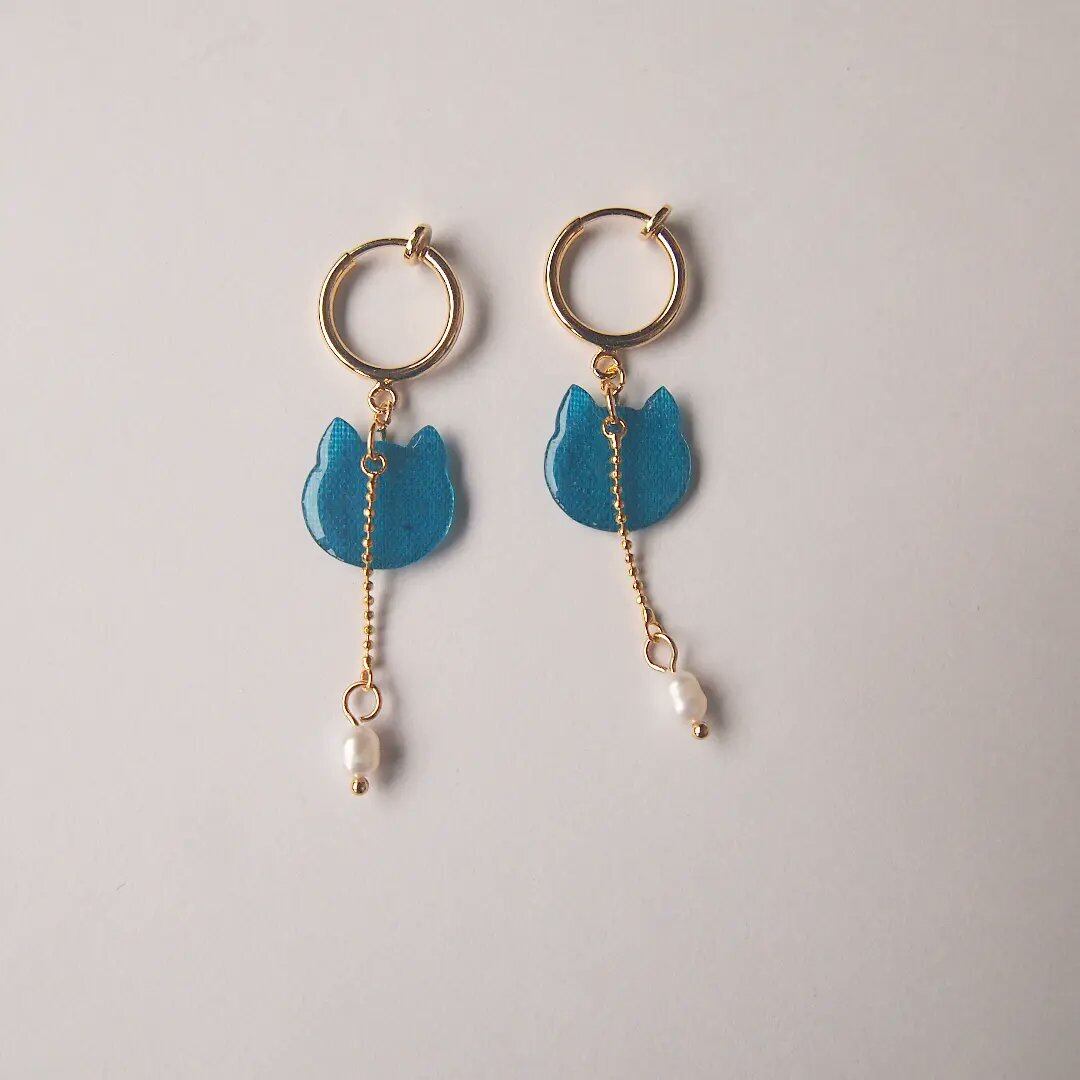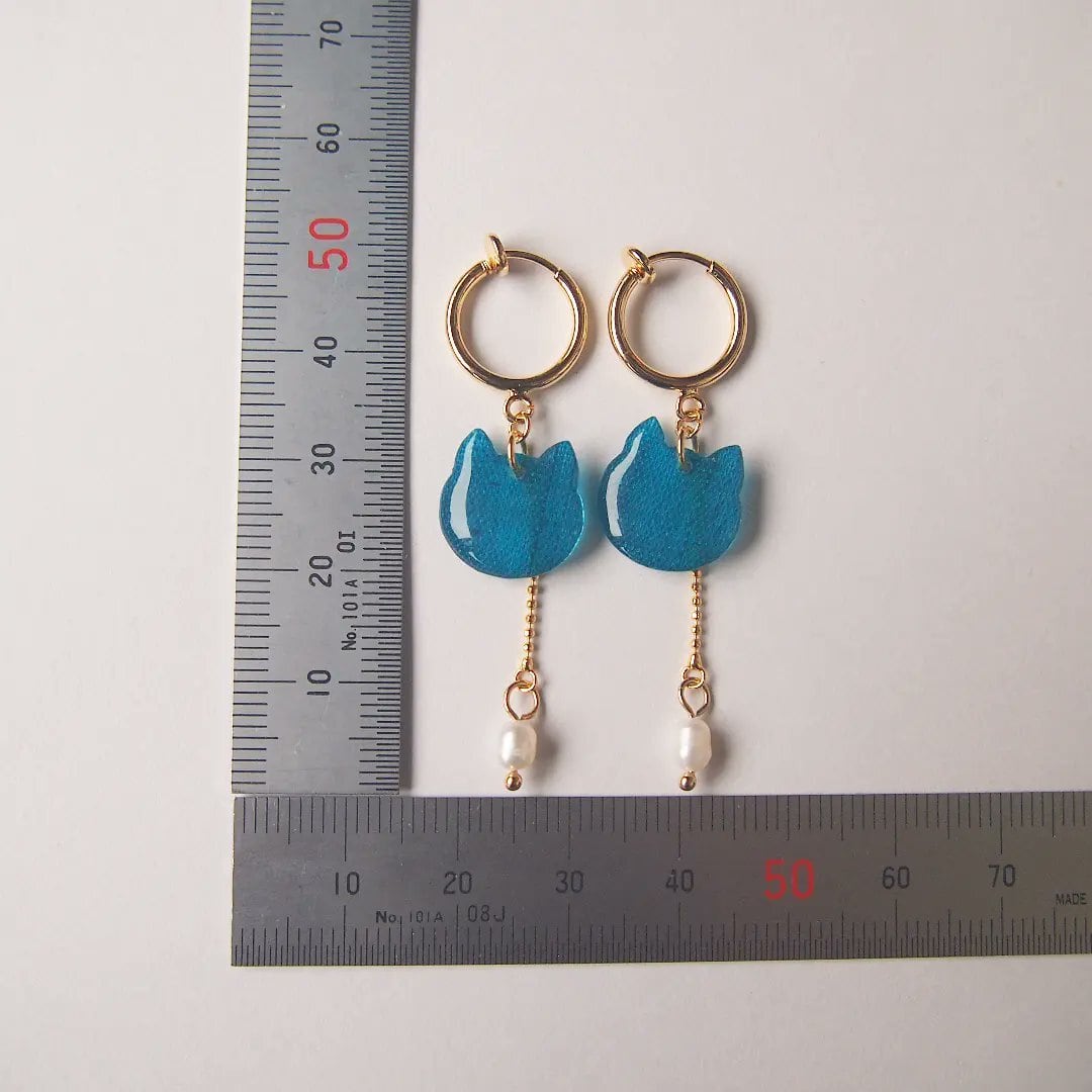 結城紬のスイングパールイヤリング(ブルー/ ネコ / K16GP)